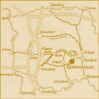 Autobahn Frankfurt-Würzburg: Ausfahrt Stockstadt. Weiterfahrt nach Obernburg - Höchst - Erbach - Marbach nach Güttersbach.